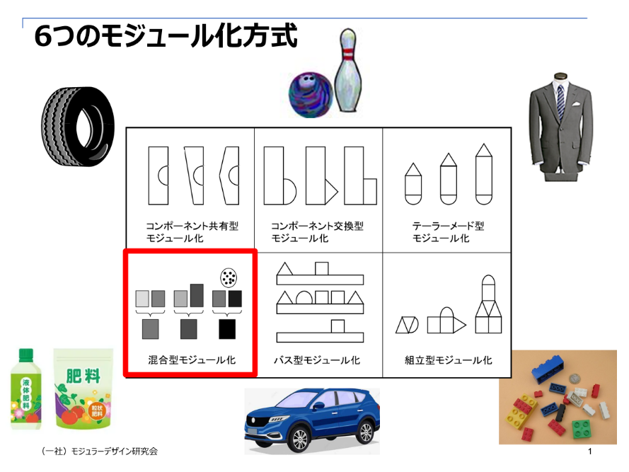 一般的にモジュラーデザインは、自動車、家電製品、工作機械関連などのハードな製品に適用することが主流になっています。今回は、ハードな製品以外の化学製品へのモジュラーデザインの適用を考えてみたいと思います。1.6つのモジュール化方式