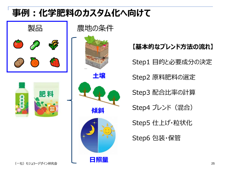 ここで、化学肥料のプロセスをもとに、モジュール化を考えてみましょう。化学肥料は野菜・くだものなど製品に合わせ、顧客要求条件である“土壌”“傾斜”“日照量”に応じてそれぞれの農地の条件を分析し、それに合わせた原料のブレンド行い農地ごとにカスタマイズされた化学肥料を提供していきます。