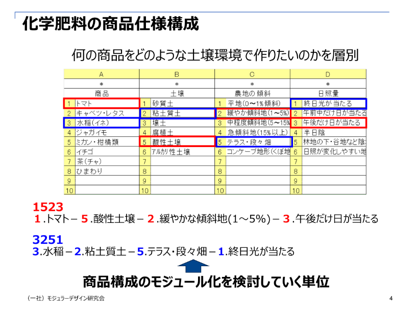 以上がタイプの内容ですが、これらを顧客要求に対し組合せを考えていきます。野菜・くだものの各商品に対し、これらのタイプの組合せを構成することにより、商品構成におけるモジュール化の単位を明確にすることができます。たとえば商品が「トマト:1」の場合、土壌が「酸性土壌:5」、農地の傾斜が「穏やか傾斜地(1~5%):2」、日照量が「午後だけ日が当たる:3」であれば、「1523」が商品構成のモジュール化を検討していく単位になります。
