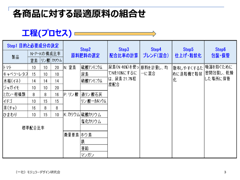 「Step1 目的と必要成分の決定」では、商品である作物の種類によって、窒素:N、リン: P、カリウム:Kの標準配合比率が決まっているので、大まかな層別をすることが可能です。例えばトマトはN:P:Kの比率が10:10:20、キャベツ・レタスは15:10:10になります。顧客要求によっては、標準配合比率から外れるものもありますが、3~5年間の過去の顧客要求を分析し、技術的に可能な配合比率のパターンを把握することが重要です。モジュール化において重要なことは、顧客要求を事前に察知しその要求を標準として用意しておき、範囲を拡大していくことを心がけることです。