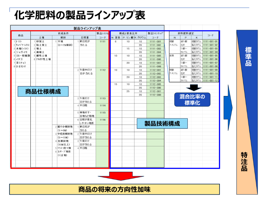 それでは化学肥料を「商品仕様構成」について検討していきましょう。化学肥料は野菜・くだものを作るにあたり、育てる環境の“土壌”“傾斜”“日照量”の組合せから商品のパターンを明確にしていきます。最初にタイプの内容を明確にし、整理してみましょう。