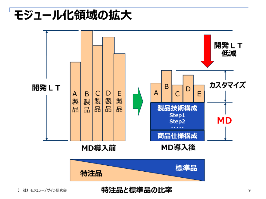 現在、日本の製造業は90%が受注生産(特注品)と言われています。モジュール化は、従来、見込生産に適用すると効果があると考えられていましたが、モジュラーデザインでは受注生産だからこそ、日常のルーチンワークを標準化し、開発設計部門においては開発LT低減に活用すべきだと考えています。これらにより得られた工数は、新しい製品を生み出す工数に費やしたいものです。
